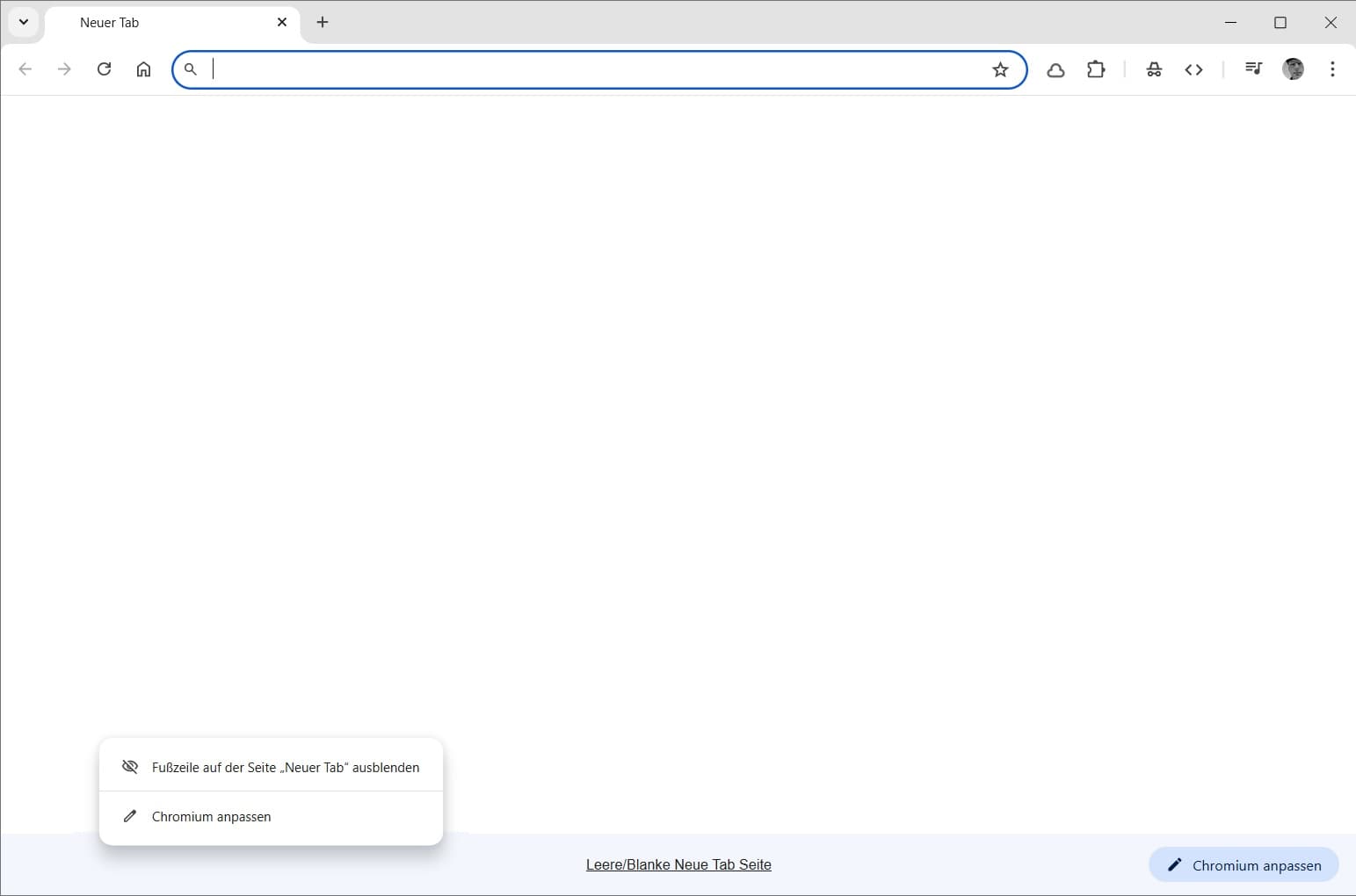 Die Sache ist eigentlich ganz einfach. Man installiert die Erweiterung Leere/Blanke Neue Tab Seite und aktiviert diese. Anschließend sieht der Browser leer aus. Die dabei angezeigte Fußzeile lässt sich, durch einen Rechtsklick, ausblenden 🙂