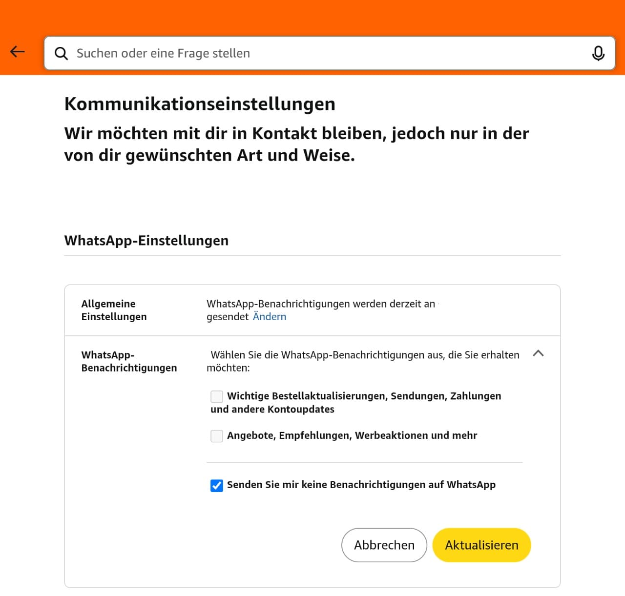 Ich habe deshalb in der Amazon-App unter „Mein Konto“ => „Kommunikationseinstellungen“ die „WhatsApp-Benachrichtigungen“ deaktiviert. Wenn euch auch solche Benachrichtigungen stören, solltet ihr das auch machen.